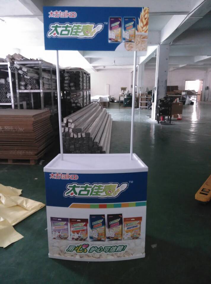 促销台又名:促销桌、铝合金促销台、PVC促销台、PS促销台、弧形促销台、半圆形促销台、拉网式促销台、拉网接待台、铁框促销台。